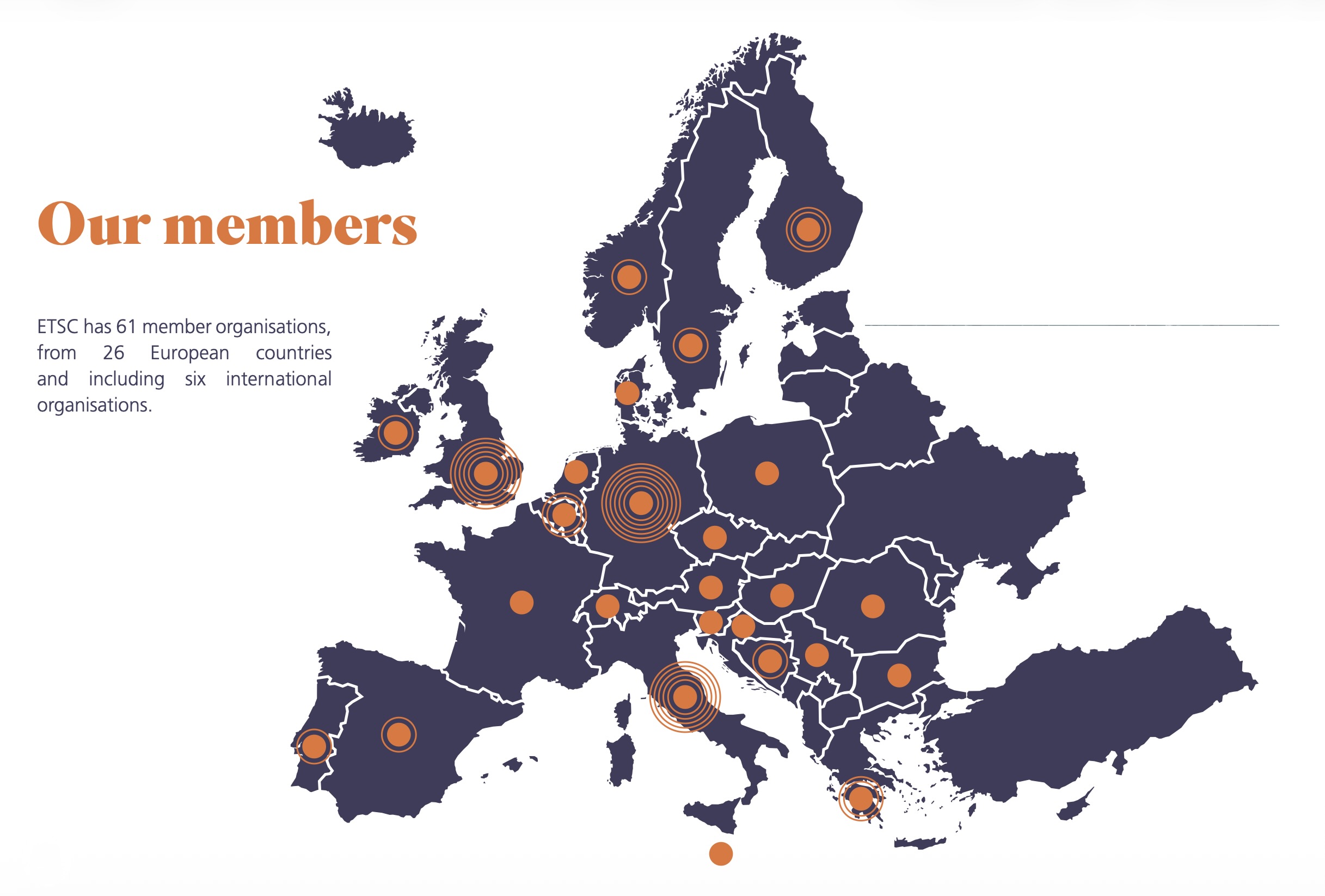 Our work is heavily based on our members’ contributions and interests. To provide an unbiased focus on European transport safety policy, ETSC seeks to bring together all major national and international safety organisations from all EU Member States.