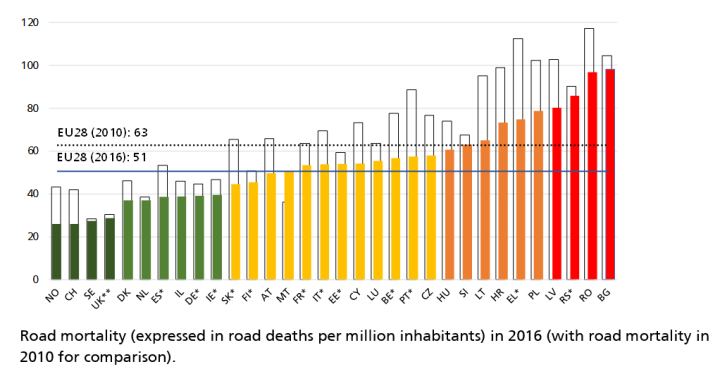 Switzerland registered a 15% drop in road deaths in 2016. Deaths have declined by 34% since 2010, and by 60% since 2001. The country now has the lowest road mortality (26 deaths per million inhabitants) in Europe, together with Norway (last year’s winner). Switzerland has climbed five places in ETSC’s ranking over the last five years.